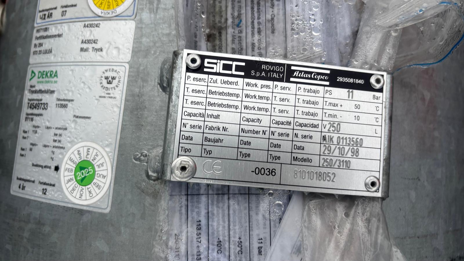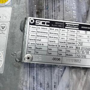 Fabrikat: SiCC / Atlas Copco Modell: 250/3110 Serienummer: AIK0113560Max arbetstryck: 11 bar Temperaturområde: -10 / +50 °C