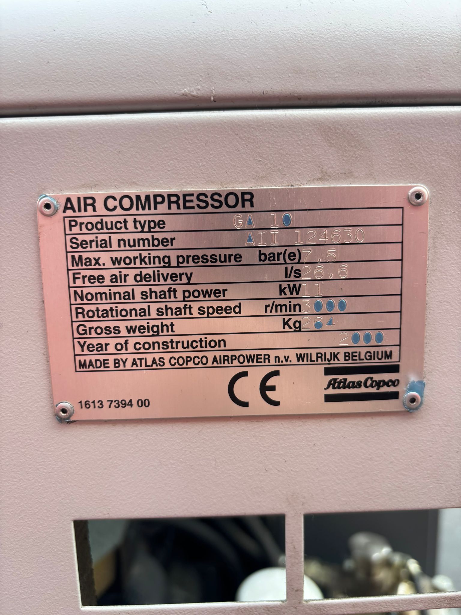 Atlas Copco GA 10  Sr.No. AII124630  11 Kw  7,5 Bar  26,6 L/S