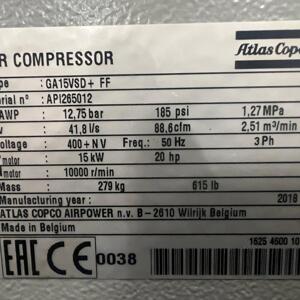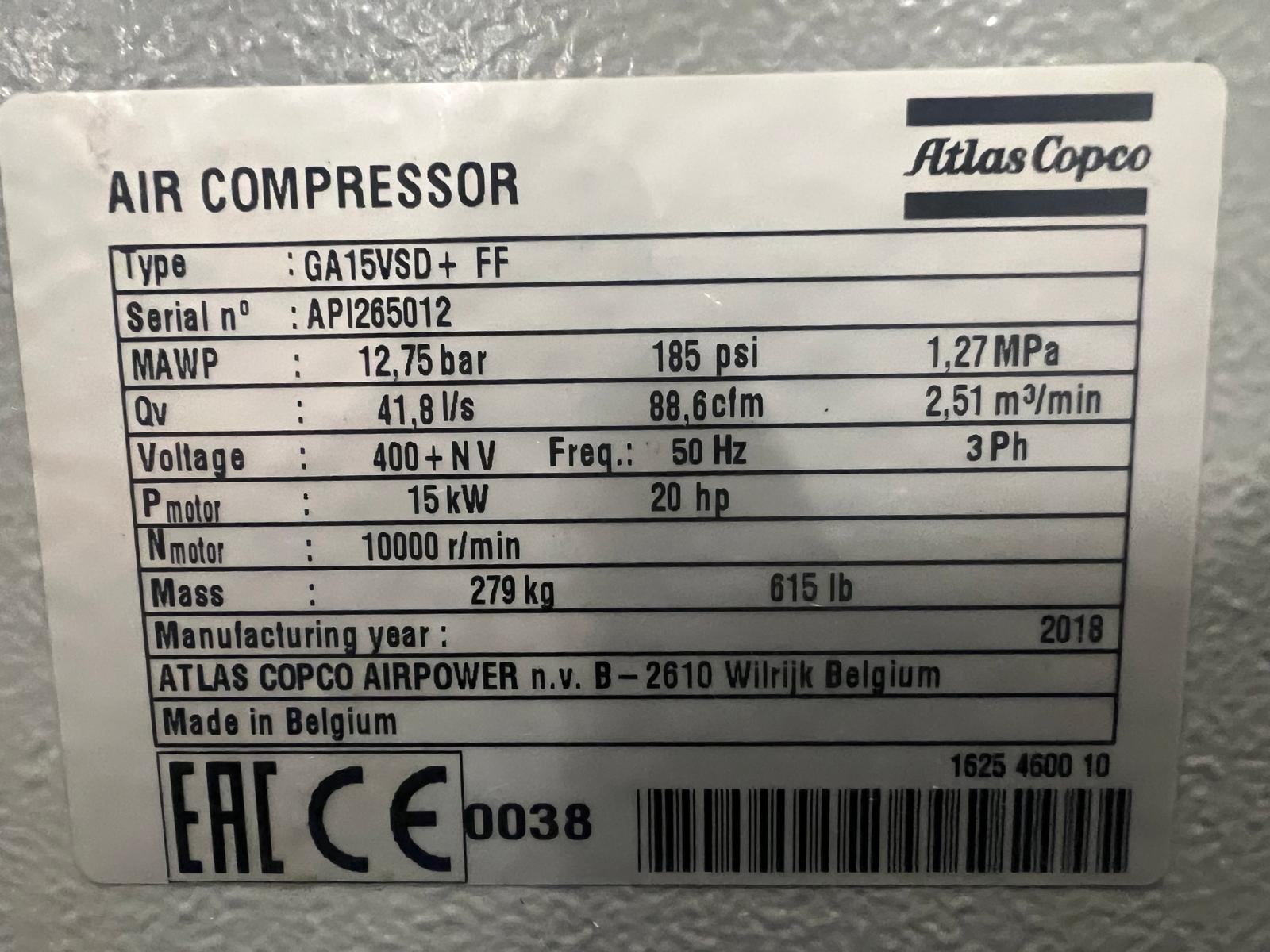 Atlas Copco GA 15 VSD+ FF  Sr.No. API265012  12,75 Bar  15 kW